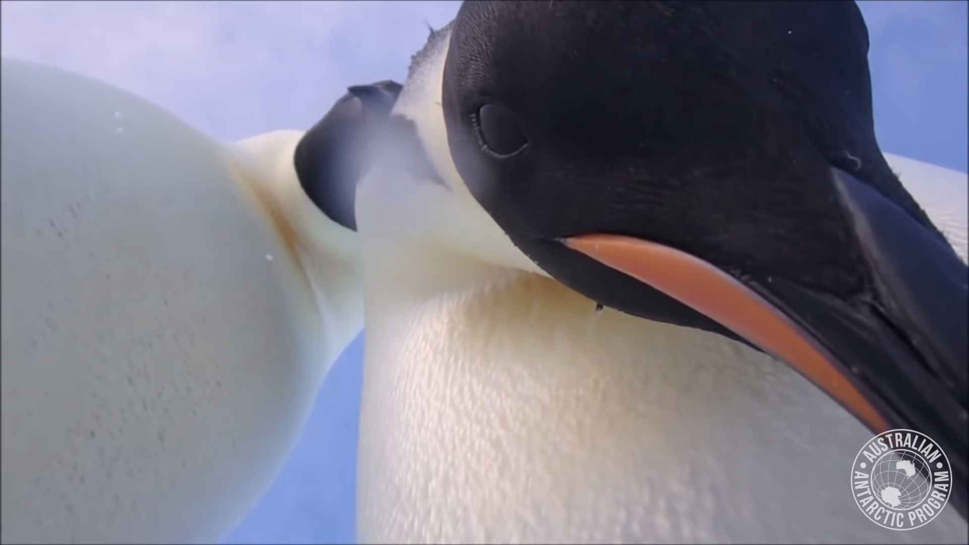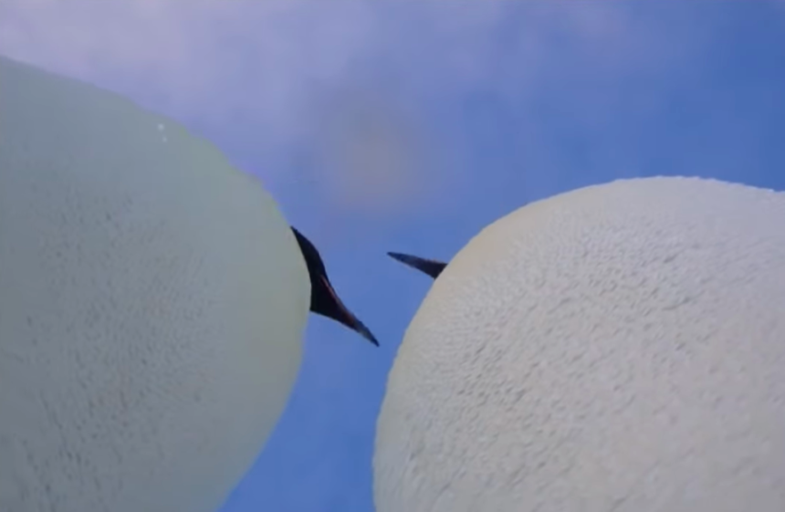 ▼Eddie將攝影機平放在冰上,本來鏡頭只能拍到企鵝們的腳丫,但牠們搖搖晃晃走過來時不小心一腳弄倒了攝影機,正好讓鏡頭對準了牠們的臉。
