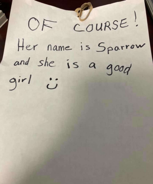 ▼Sarah把紙條貼在狗狗家大門口,在心裡默默祈禱,希望能得到肯定的答案。隔天一早她提前去上班,非常擔心被拒絕或被無視。她來到狗狗家門前時,發現門上貼了一張主人回覆的紙條:「你當然可以摸摸牠!狗狗的名字叫Sparrow,牠真的是一個很棒的女孩:)」