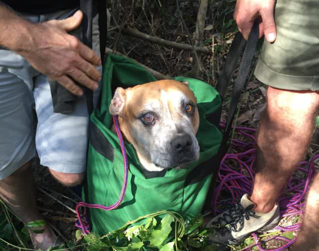 ▼他們用樹枝、大背包製作簡易擔架,讓Miss Piggy待在背包裡,然後抬著牠往前走。抬著近40公斤重的狗狗走了45分鐘,他們才終於回到車邊。