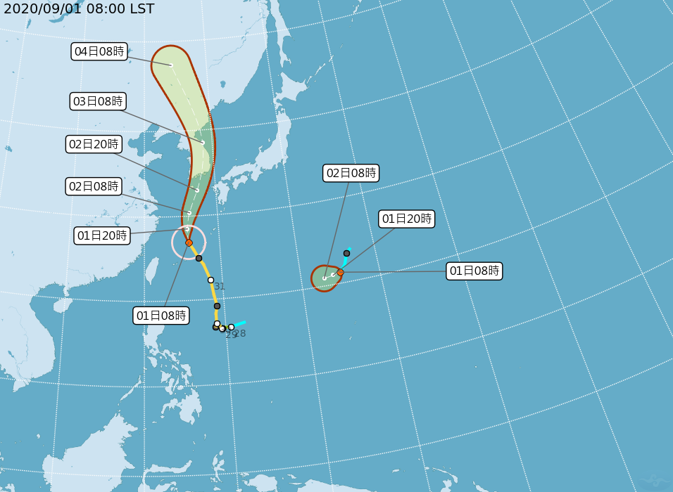2020年09月01日中颱梅莎從台灣的東北外海掠過,根據氣象局預測,梅莎有機會轉為強颱,因為颱風的外圍環流影響,北北基3縣市出現大雨特報;而目前位於關島北方海面的熱帶低氣壓TD12,則有機會增強生成今年第10號颱風「海神」。