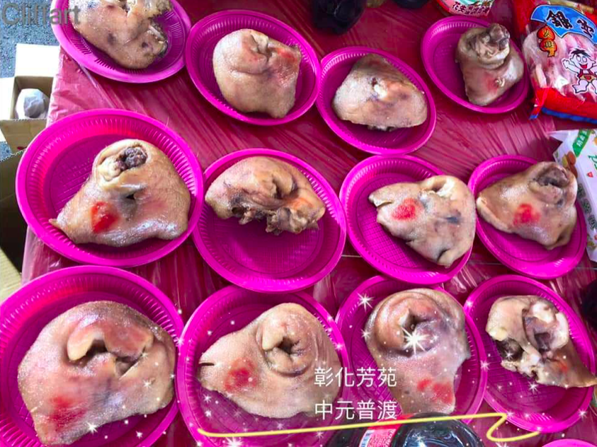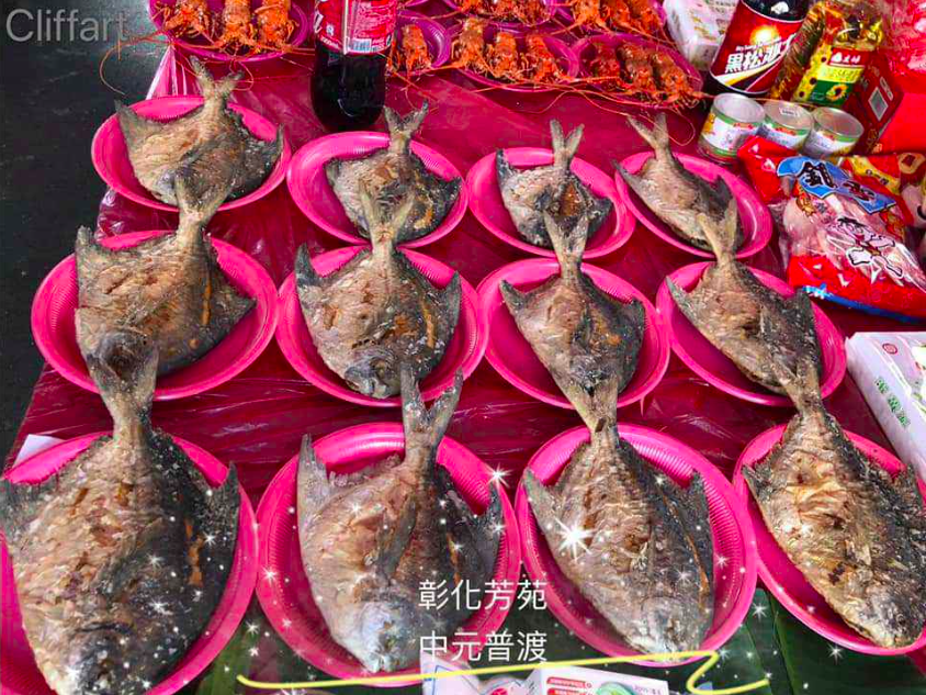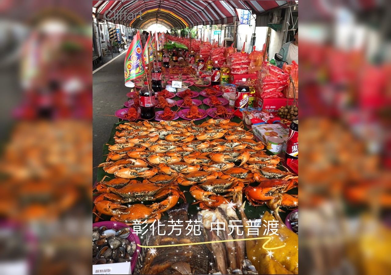 ▼這是彰化芳苑的普渡現場,桌子上全都是美食和飲料。除了最基本的水果、餅乾零食、可樂和沙士,還有白鯧魚、蛤蜊、全雞、豬肉,其中最顯眼的則是碩大的螃蟹和龍蝦。