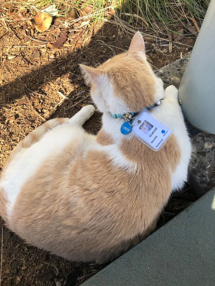 ▼這隻不怕生的橘白喵叫作Elwood,原本就常常在醫院四處走動了,每天早上還會自動自發的站在醫院門口,溫馴的讓剛來上班的員工摸摸,儼然變成一位警衛,因此醫院也就順理成章的將牠收編,並還特別給予牠一張「員工證」。