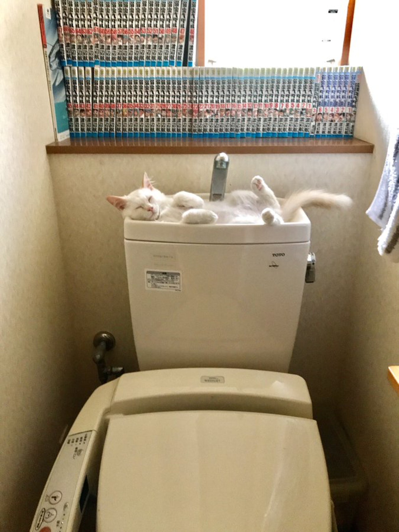 ▼網友們看到白貓的睡姿都覺得很可愛,還有人po出自家愛貓在馬桶或洗手池裡睡覺的照片,原來貓咪們都很喜歡在這裡睡。