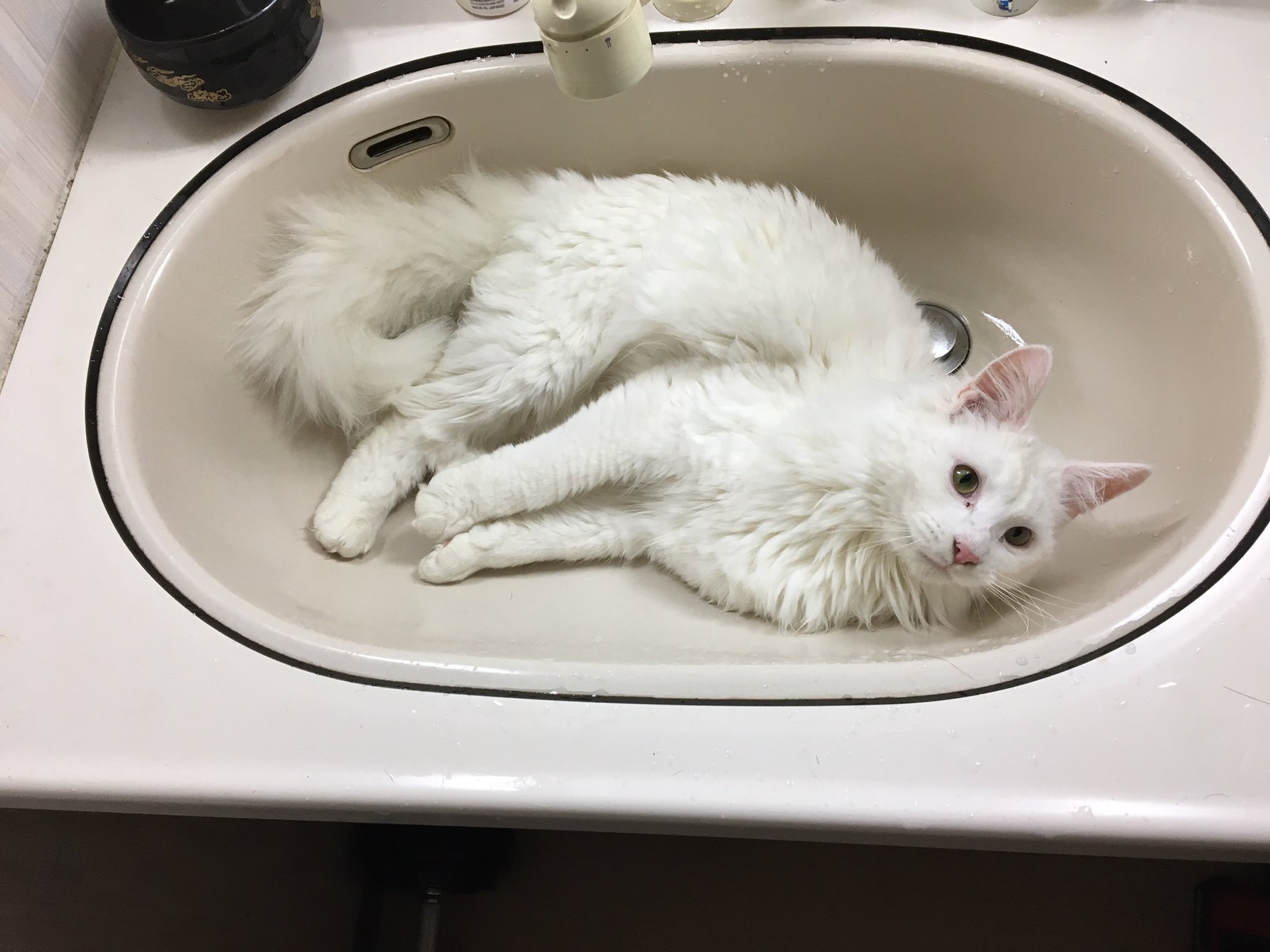 2020年09月07日貓咪天生喜歡狹窄的空間,貓奴經常能發現牠們在奇怪的地方安睡~日本推主@rabbitnavokov養了一隻萌萌的白貓,貓咪活潑可愛,經常窩到意想不到的地方休息。最近他po出自家愛寵睡覺的照片,只見貓咪窩在廁所的洗手池裡,四腳朝天睡得很香甜。