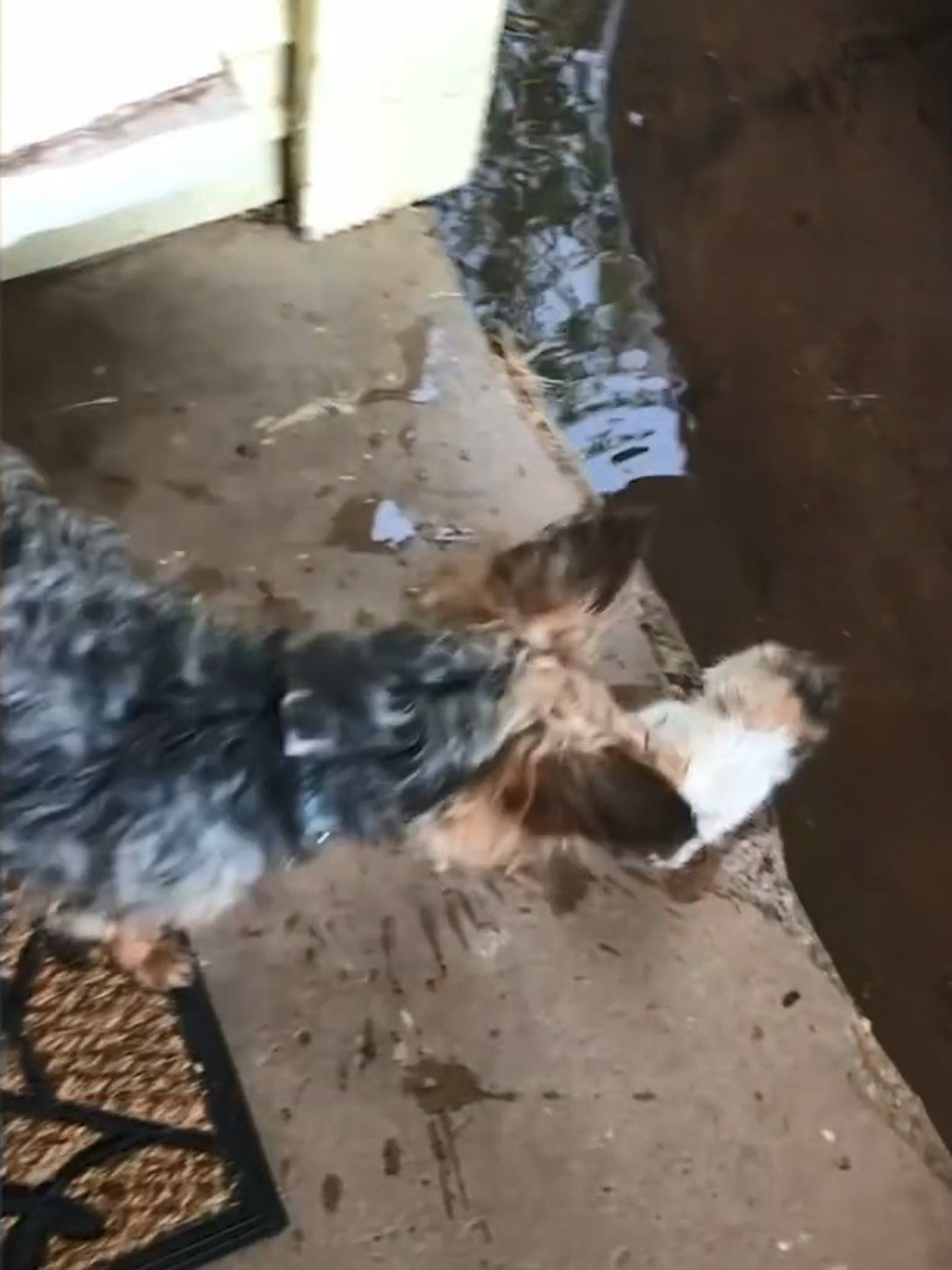 ▼遇到積水Hazel也十分有耐心地停下來等小貓跟上。