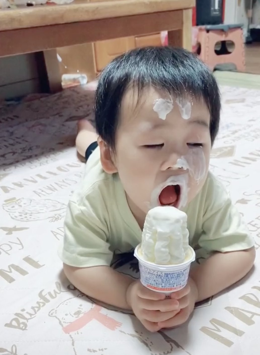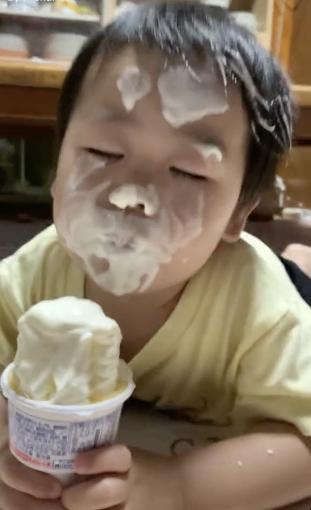 ▼影片一開始就能看到,北鼻已經睡眼惺忪+臉頰被霜淇淋沾到糊成一團,但還是張大嘴想要再吃一口…