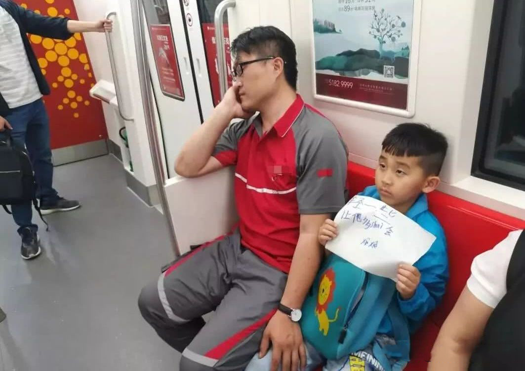 ▼小男孩擔心別人吵醒爸爸,這才寫了這張紙條,他在用自己的方式守護爸爸。大家都能體諒,上下車經過他們身邊時都會放輕腳步。這個小男孩一直堅定地舉著那張紙條,守護著爸爸,等待爸爸睡醒。