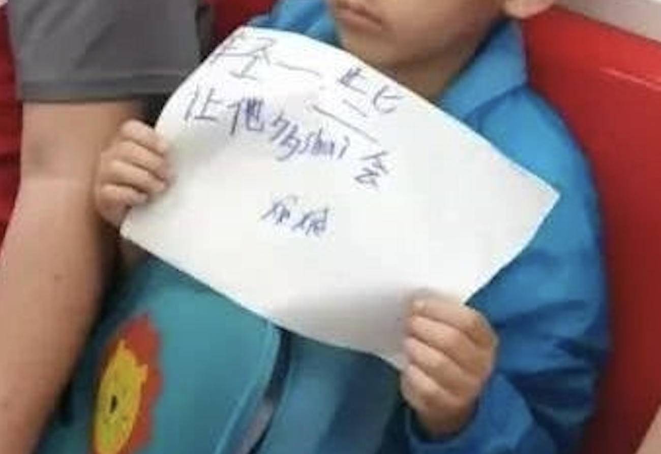 ▼小男孩看爸爸睡熟了,就乖乖坐著不敢亂動,生怕會吵醒爸爸。他還拿出一張白紙,寫道:「輕一點,讓他多睡會兒,謝謝。」這幾個字寫得歪歪扭扭、參差不齊,還有幾個字不會寫,只能用拼音代替,但其他乘客看到都會懂他的心意。
