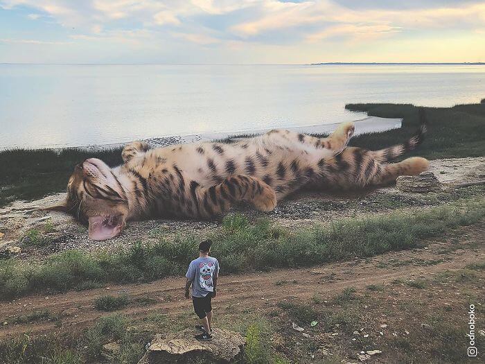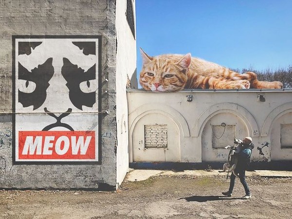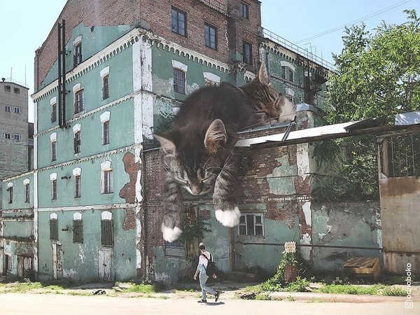 ▼Andrey將巨大貓咪的照片融入自己的作品的,剛開始他只是覺得有趣,沒想到竟引起了網友們的關注,這些照片很快紅遍網路。