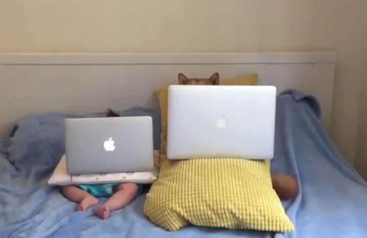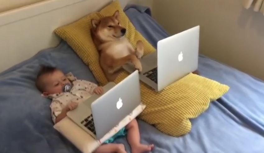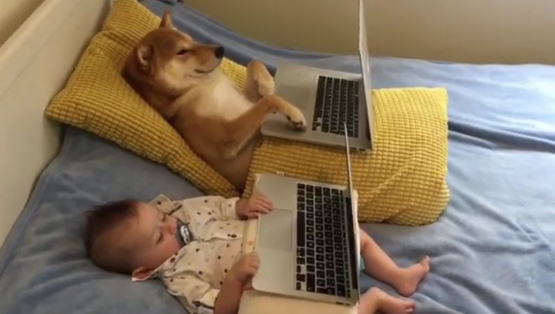 ▼只見Chiko和寶寶躺在床上,一人抱著一台筆電看得超認真。小主人剛剛6個月大,看起來跟Chiko的體型差不多。他們仰躺在床上,小主人嘴裡還叼著奶嘴,一起追劇快樂多多。
