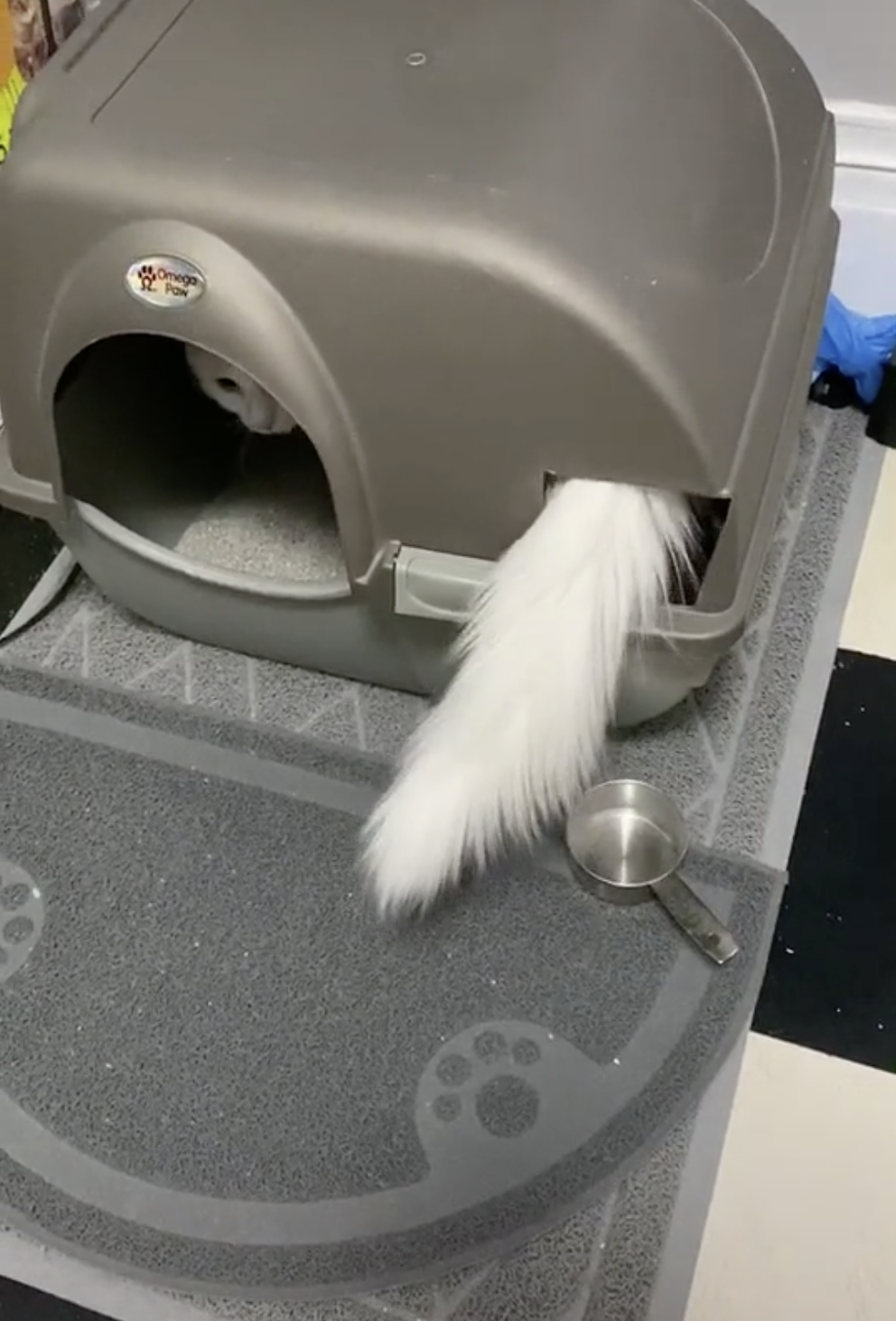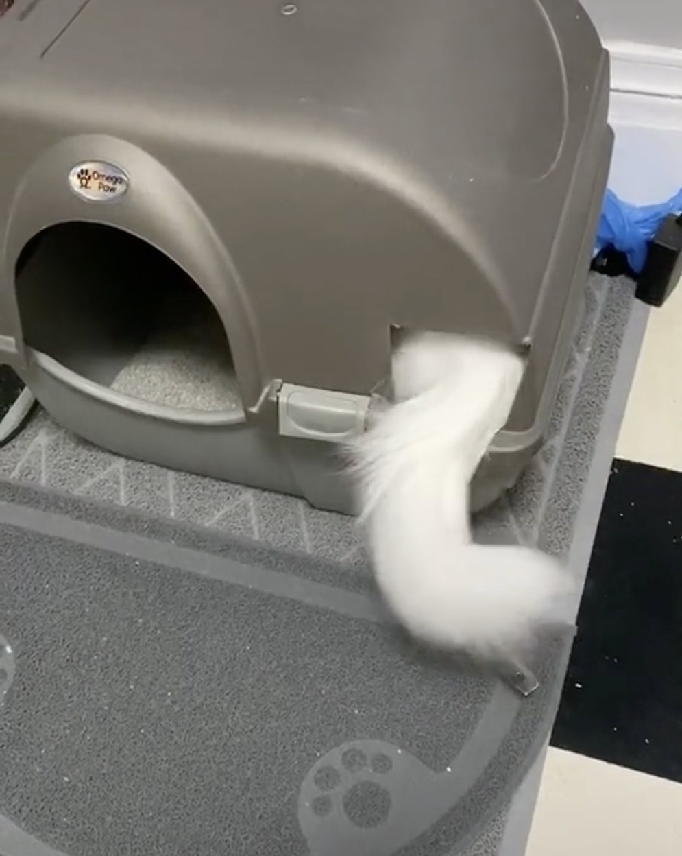 ▼鑽進去後,雪白的毛茸茸長尾巴還是翹在貓砂盆外面,看起來相當滑稽,看起來喵皇相當滿意裡面隱密的空間喔。