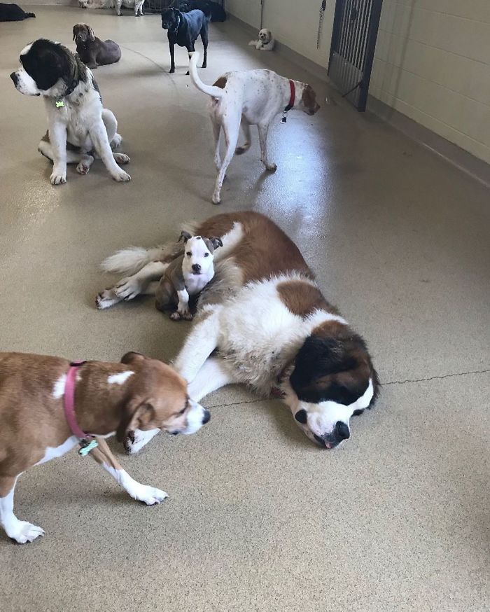 Edna已經是一隻大狗狗了,還喜歡靠在同伴身上睡覺。那些體型小巧的狗狗被牠當成枕頭,看起來就很沈重。Edna可能還以為自己是當初那個體型小巧的狗寶寶吧!