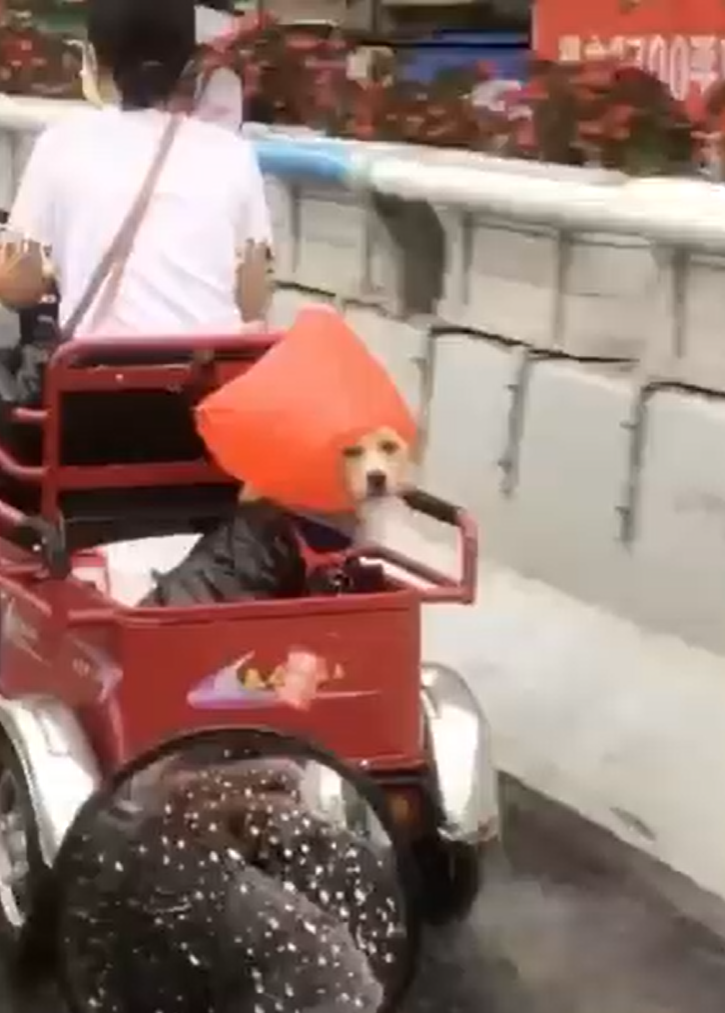 ▼狗狗身上穿著黑色雨衣,頭上則戴著紅色塑膠袋特製的雨帽,一點雨都淋不到。主人自己淋雨也要把牠照顧得非常妥貼,一定很愛牠。