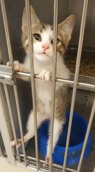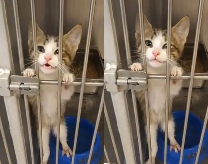 ▼當時COVID-19非常嚴峻,收容所的工作人員建議大家不要碰觸毛孩。那隻貓咪本來獨自待在籠子裡,牠看到有人路過,馬上喵喵叫了起來。貓咪的後腳踩在水碗裡,前爪抓著欄杆,努力想要靠近路過的人,那急切的模樣讓人很不捨。