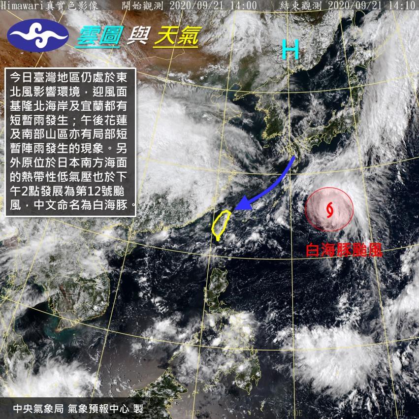 2020年09月22日上一波鋒面過去,今天(22日)天氣相對較穩定,山區與鄰近山區將會有午後雷陣雨;而第12號颱風輕颱「白海豚」目前位於距離東京1080公里南方海面上,並正以17公里的時速向北移動,預計在24日靠近日本關東地區的南方海面,會轉變成溫帶氣旋,距離台灣相當遙遠,所以對台沒有影響。