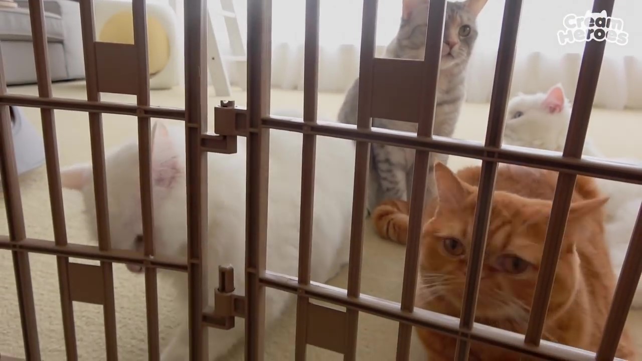 ▼老虎被關起來後,貓咪們反而對它更感興趣了,紛紛圍過來觀察它。