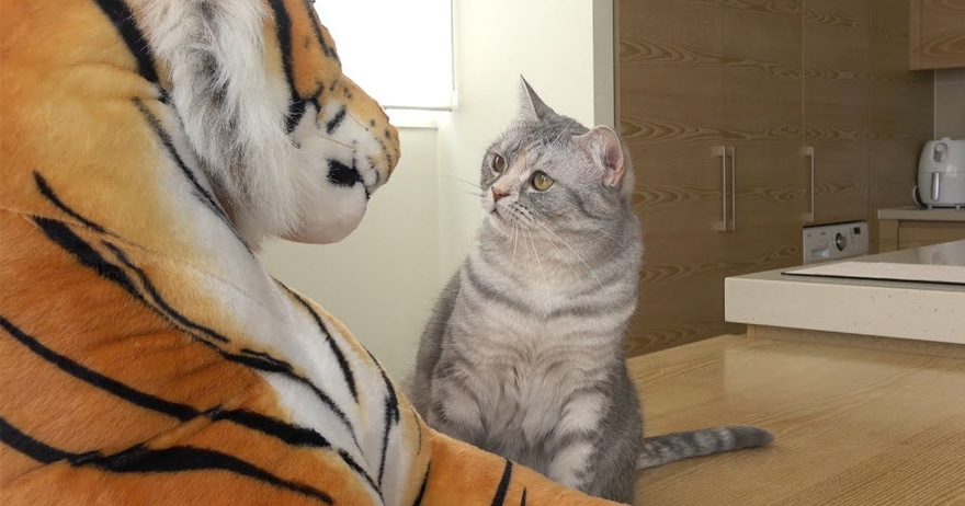 小貓遇到大貓!她準備老虎大玩偶 7主子見面「反應各種呆」網笑:秒看出個性~