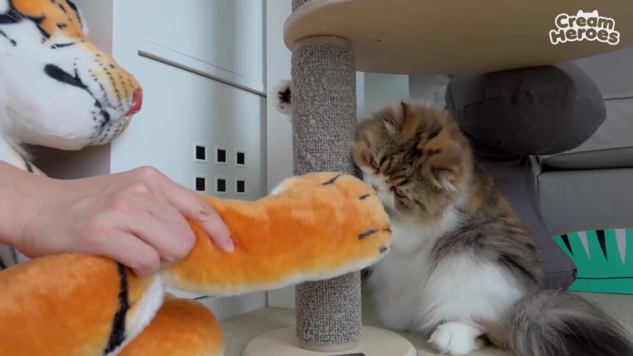 ▼主人先把老虎玩偶放到第一隻貓咪CHUCHU面前,還拿著它的爪子活動。CHUCHU縮在安全的角落,對面前的大傢伙充滿好奇。