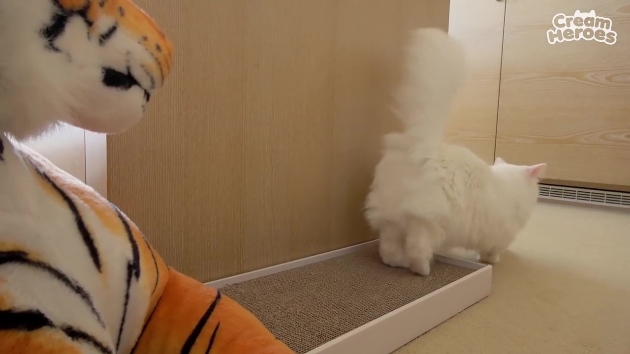 ▼這隻白貓對老虎玩偶很熱情,不過跟它玩了一下就離開了:「好無趣的傢伙!」