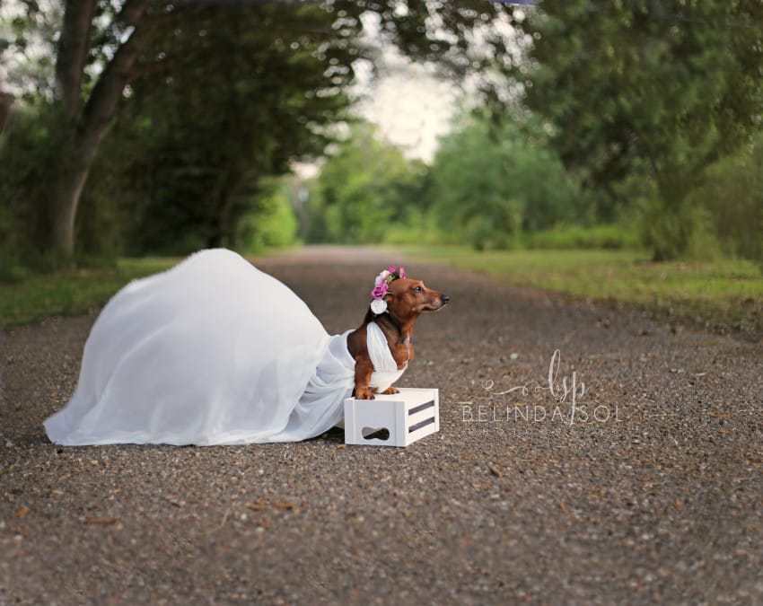 ▼這隻臘腸犬叫Mia,初次拍攝時牠即將臨盆,和幼犬的爸爸一起拍攝了一組超浪漫的婚紗照,後來幼犬出生後又拍攝了一組親子照。