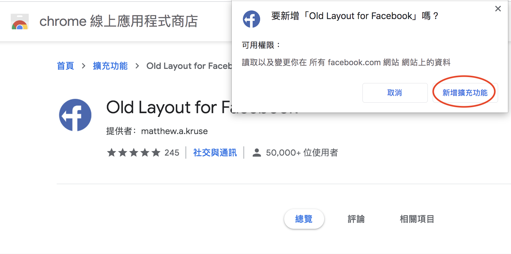 ▼首先,開啟「Old Layout for Facebook」擴充功能的頁面,並點選右上方藍底白字「加到Chrome」選項、再點彈出式視窗上的「新增擴充功能」,即可開始進行安裝。
