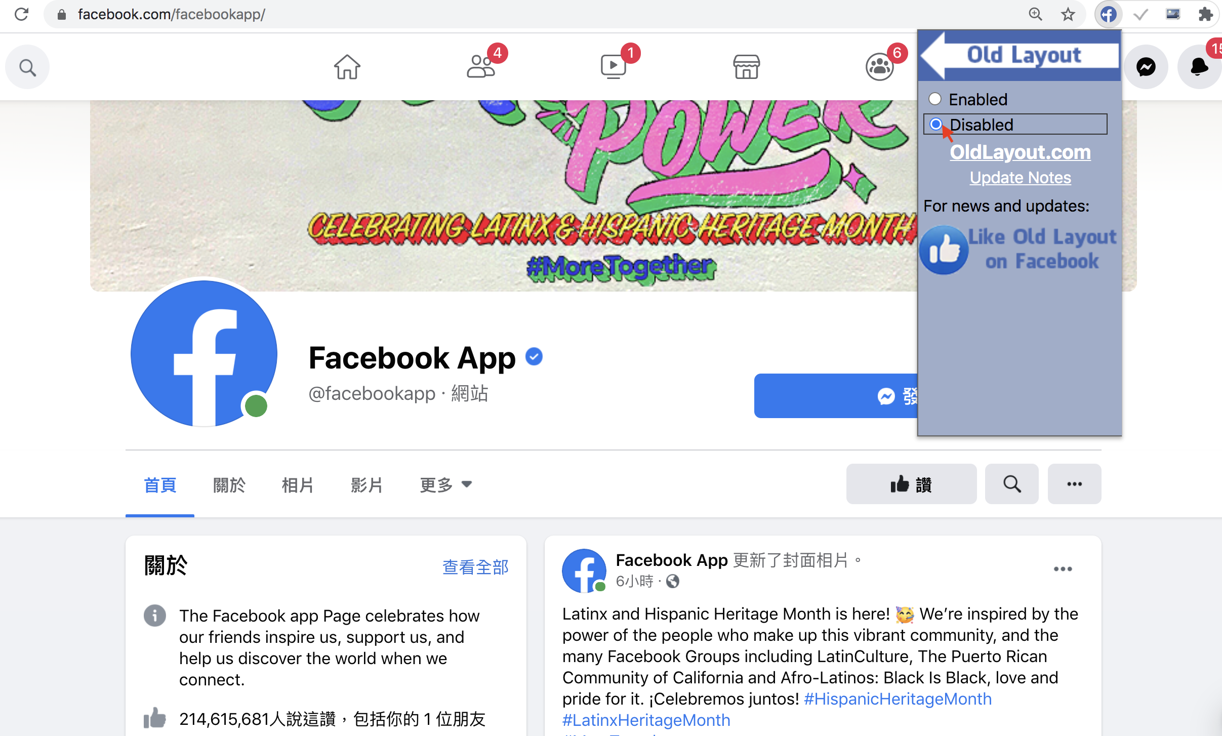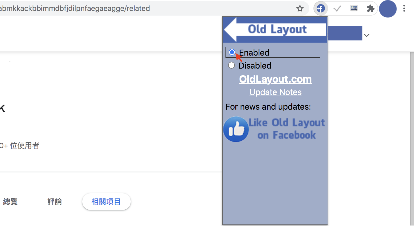 ▼安裝後,只要點選Google Chrome右上角「Old Layout for Facebook」的按鈕,選擇「Enabled」,並重新整理網頁,即可還原到經典舊版Facebook。