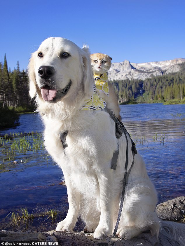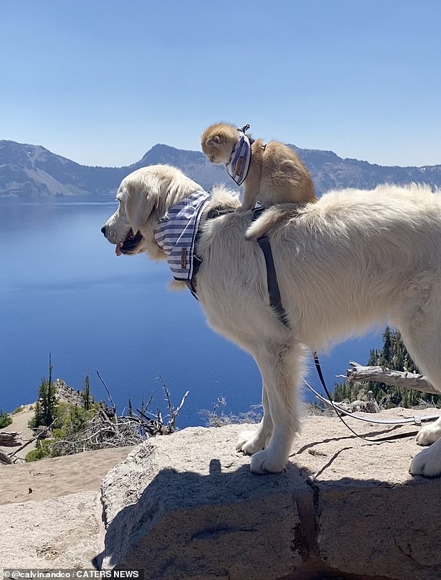 ▼主人帶毛孩們外出徒步旅行時,小小年紀的Cleo走了不久就累了。牠跳到Samson的背上休息,Samson並不反對,甘當座騎背著牠走。