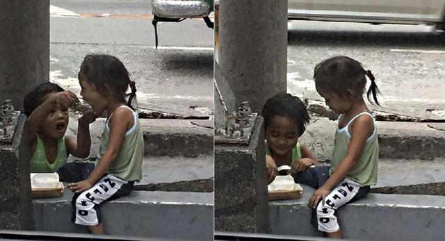 ▼當時這對情侶並沒覺得不對,還以為小男孩將食物拿回家吃了。但他們散步途中又看到了那個小男孩,他正面帶笑容給一個小女孩餵飯!原來這個小女孩是他的妹妹,這位小哥哥把自己乞討得來的食物全部餵給妹妹吃。