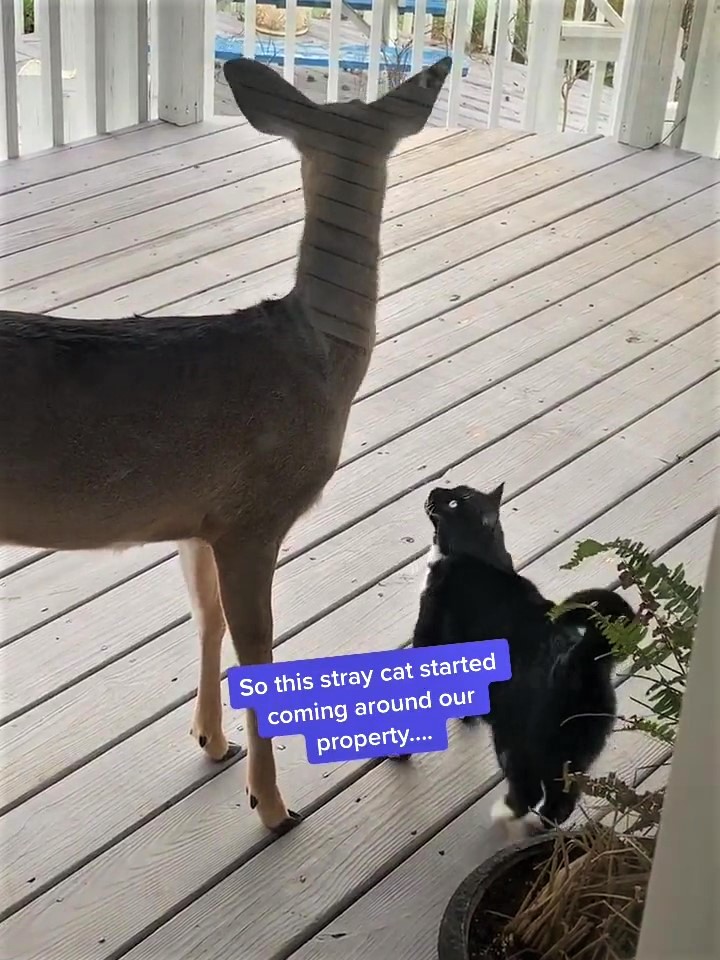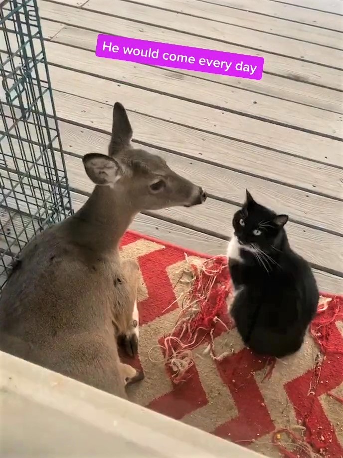 ▼Dottie和O’Malley的感情越來越好,牠們會靠在一起休息,一起玩耍,這跨越物種的友誼非常感人。Cort發現O’Malley每天都來找自家的小鹿後,就在門廊上準備貓糧,讓兩個小夥伴一起吃飯。現在O’Malley已經被餵得胖乎乎,看起來根本不像流浪貓。不過O’Malley還是不願意跟人類接觸,只願意跟小鹿交朋友。