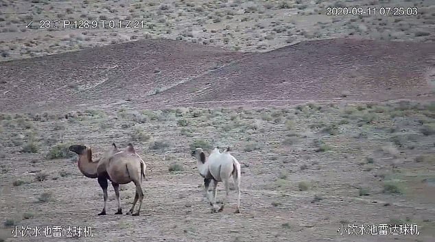 ▼專家鑑定影像資料後表示,這是一隻白化野駱駝,跟野雙峰駝是同一物種。這是一種非常罕見的現場,跟白虎、白獅一樣。目前只是觀察到了這隻駱駝的膚色,牠長出的毛是不是白色的,還需要進一步觀察研究。
