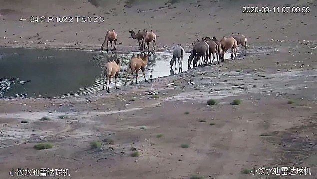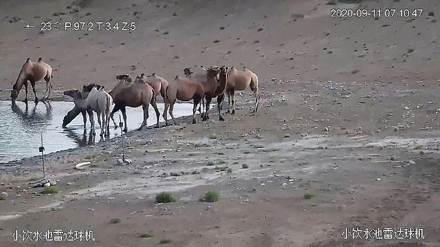 ▼這段影片被拍攝於9月11日,當時11隻野駱駝聚在黃羊溝野生動物飲水池喝水,這隻白色的野駱駝跟其他駱駝形成鮮明的對比。