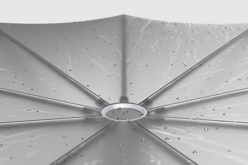 ▼Nonagon Umbrella內的過濾系統簡單有效,雨水經過3次過濾變成飲用水。雨傘頂部裝有金屬網,能夠初步把較大的顆粒擋下來,然後經過活性碳濾材與過濾膜層,把更細的雜質與異味清除。這樣3個步驟下來,天上落下的雨水就被過濾成乾淨能喝的水了。