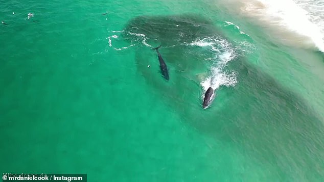 ▼43歲攝影師Daniel Cook偶然將這一幕拍了下來。他表示這一切都是偶然,當時他跟家人一起在海灘度假,家人看到衝浪者和海豚,認為用無人機能拍到更美的畫面,沒想到竟然還有2隻鯨魚。