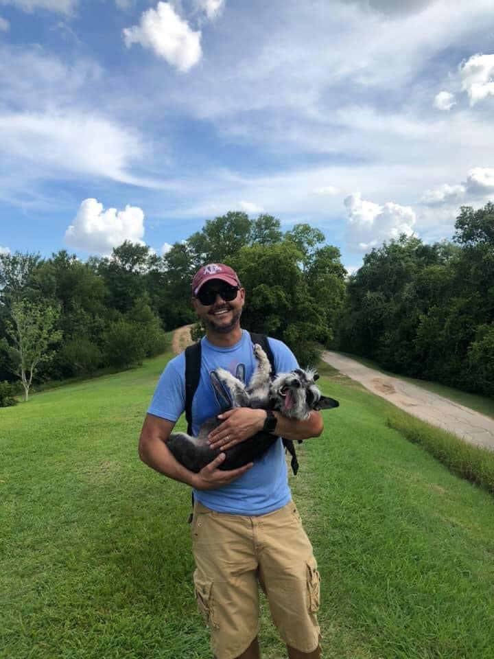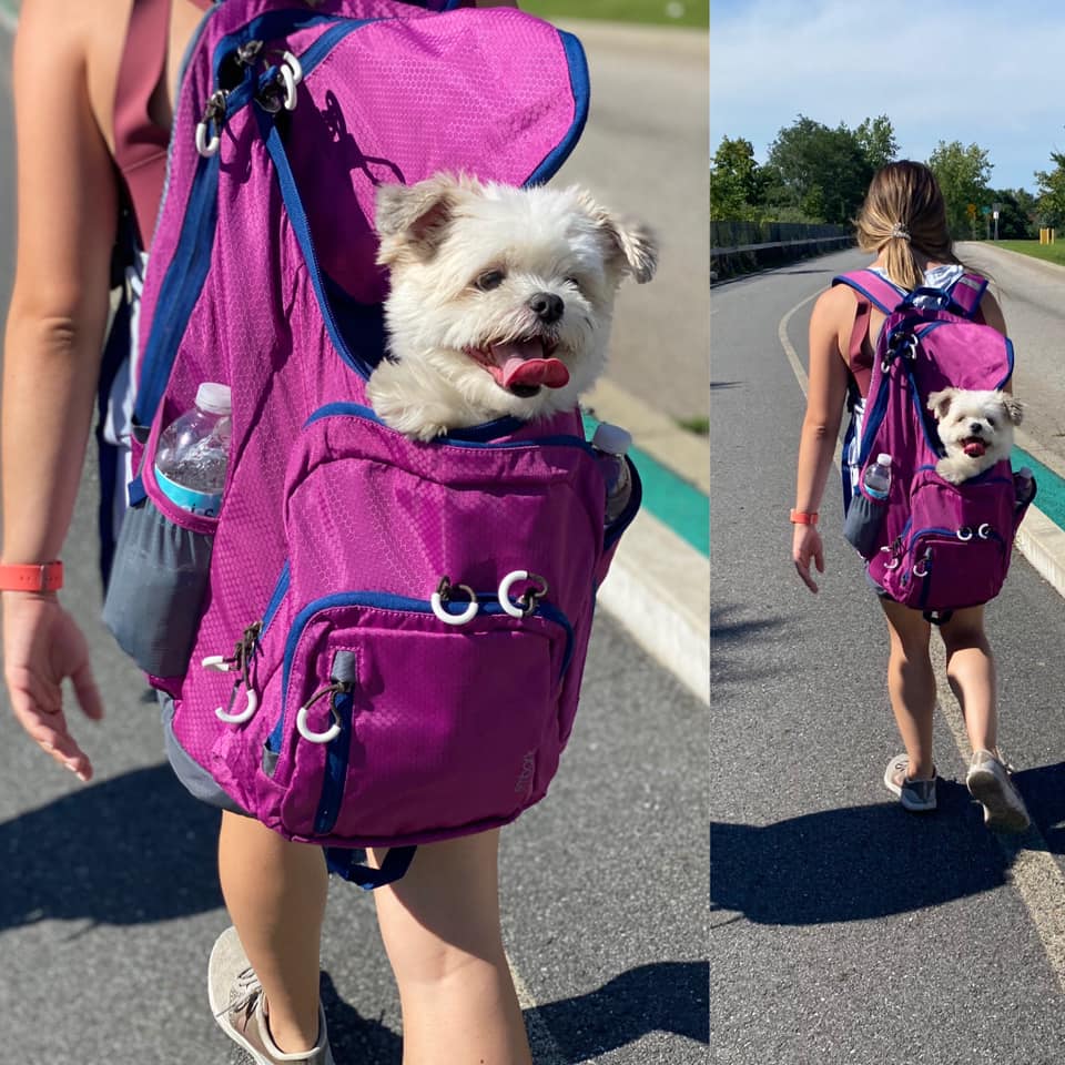 ▼爸爸為了讓狗狗舒服一些,全程彎著腰走路,走了整整3公里。媽媽開玩笑說:「這就是為什麼我們通常把毛孩留在家裡!」