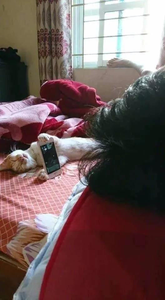2020年10月05日很多人認為貓咪天生冷淡,不像狗狗那樣親人。其實牠們也有豐富的感情,有些貓咪非常黏人。雖然牠們看起來傲嬌,但心裡非常愛奴才~日前一名網友分享了一系列有趣的照片,照片中的他躺在床上追劇耍廢,貓咪竟然化身手機支架,幫奴才撐著手機。