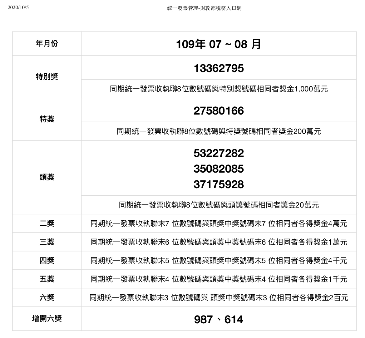 ▼在9月25日開出的7、8月同一發票中獎號碼中,1000萬元特別獎號為「13362795」,200萬元特獎獎號為「27580166」和20萬的頭獎三組獎號分別為「53227282」、「35082085」、「37175928」,增開2組200元的6獎號碼為尾數「987」、「614」,可於10月6日至2021年的1月5日間領獎。