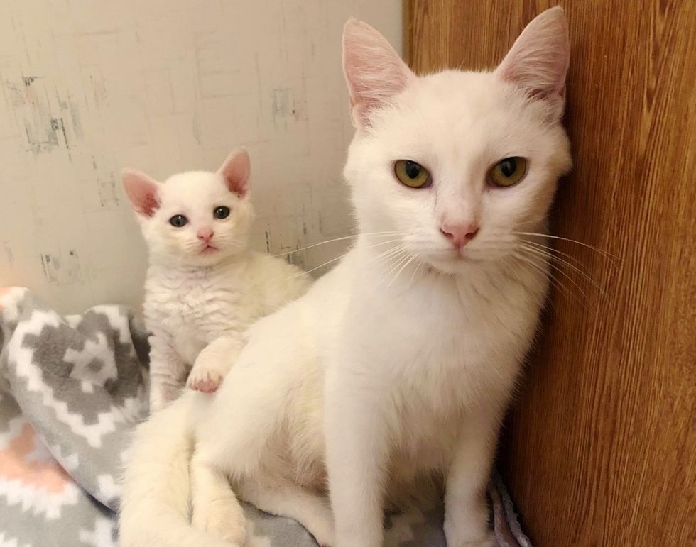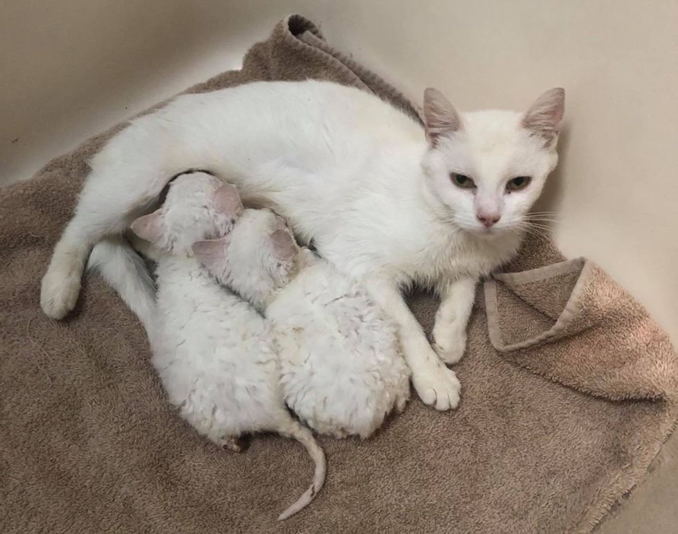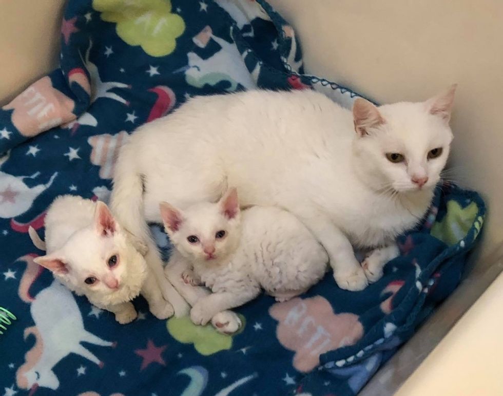 2020年10月10日貓咪懂得向人求助!近日美國印第安納州(Indiana)一個家庭在後院發現了一隻白貓。牠身邊還有2隻小奶貓,顯然是牠的小孩。他們本想給貓咪餵食,靠近後才發現牠們需要幫助。小奶貓們呼吸道、胃都有問題,身上還有跳蚤,於是他們聯絡動物救援機構「Catsnip Etc」,請志工來幫忙。