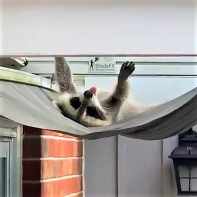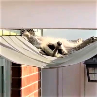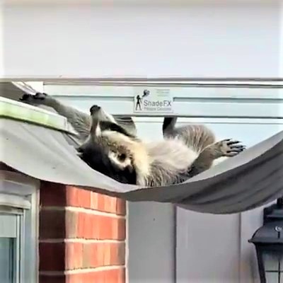 2020年10月10日現在連野生動物都追求生活品質,懂得享受生活了!加拿大女網友Heather Jenkins家裝有遮陽棚。有一天她出門時發現遮陽棚凹了一大塊,上面似乎有什麼東西。Heather抬頭看了看,這才發現那裡有一隻野生浣熊。
