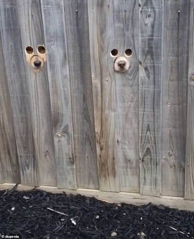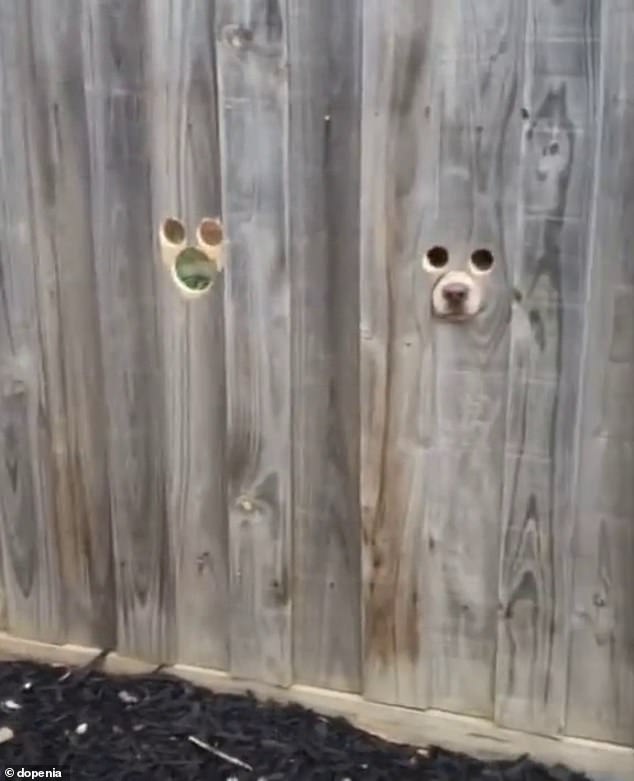▼這位飼主在木製圍牆上挖了幾個大小不一得洞,1個大洞和2個小洞組合,看起來像「米奇頭」的形狀。狗狗們可以將鼻子放在大洞裡,然後透過兩個小洞觀察外面的情況。這個設計非常奇妙,哪怕狗狗們不透過這些洞看外面,它們也不會顯得違和,反而像是創意十足的裝飾。