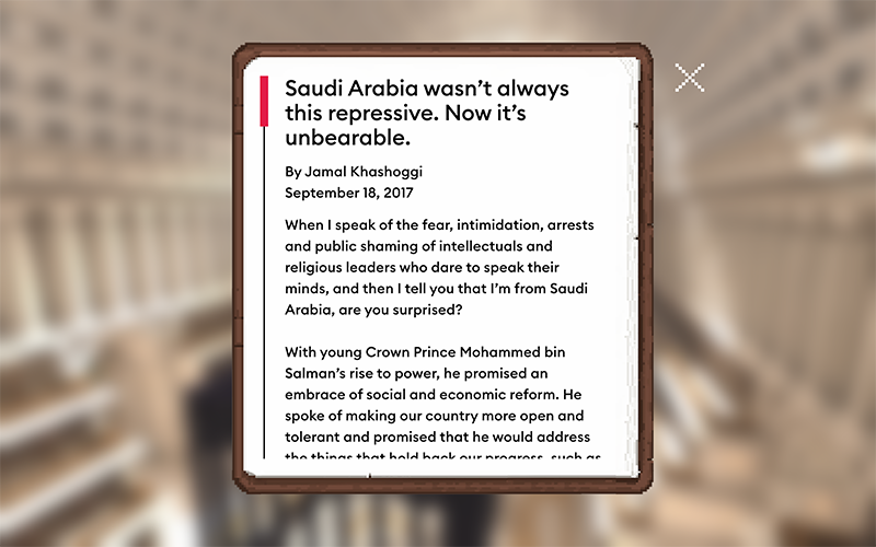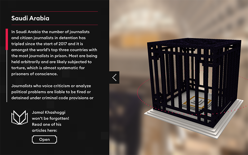 ▼在君主集權的沙烏地阿拉伯中,無數新聞工作者被捕入獄,數量堪稱世界之最。因此在沙烏地阿拉伯區塊中,正中央就放了一個牢籠,象徵被囚禁的新聞自由。