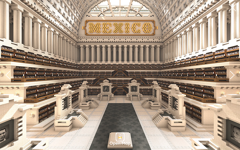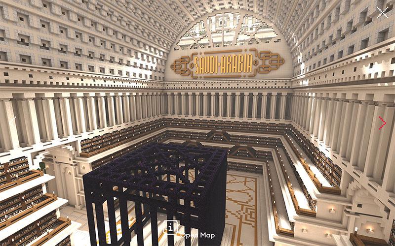 ▼在這座龐大的圖書館中,創世神玩家可以在官網下載整份資料,選擇以單人模式,或JAVA離線方式瀏覽,也可以登入伺服器成為眾多閱聽者之一。館內所陳列的國家都還未禁止對創世神的連線,由於這些國家的玩家眾多,NGO無國界記者組織正是希望藉此散播訊息。