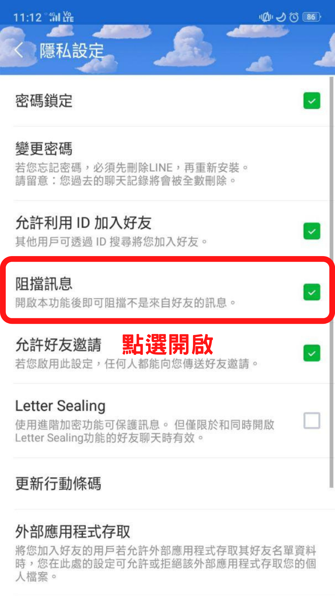▼將「阻擋訊息」開啟,這可以阻擋不屬於你好友的訊息。