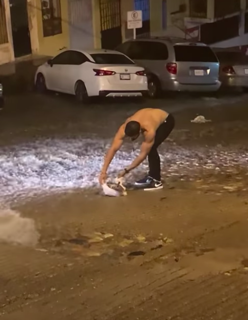 ▼那水流對體型小巧的負鼠來說是可怕的洪水,但對人類來說卻不算什麼。Abraham走到負鼠旁邊,脫下白色T恤包住負鼠,將牠帶到了不會積水的高處。那隻負鼠看起來已經精疲力竭,被他抱著時並沒有動彈。