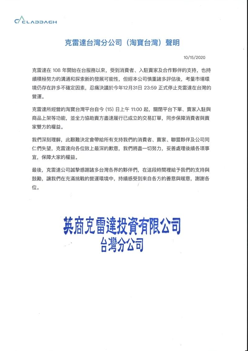 ▼今日克雷達台灣分公司(淘寶台灣)突然發表聲明,將於今年底結束在台灣的營運,至於對數十萬賣家,則需將訂單流程走完,若消費者要退款也會有客服團隊協助。淘寶台灣表示,商城賣家在平台上有一筆押金,只要將訂單完成出貨,走完流程就會撥退押金,轉入帳號電子錢包,因此商城用戶權益仍獲得保障。淘寶台灣主要分為商城、拍賣戶商家,拍賣店家比商城多一些。以下為克雷達台灣分公司(淘寶台灣)聲明全文: