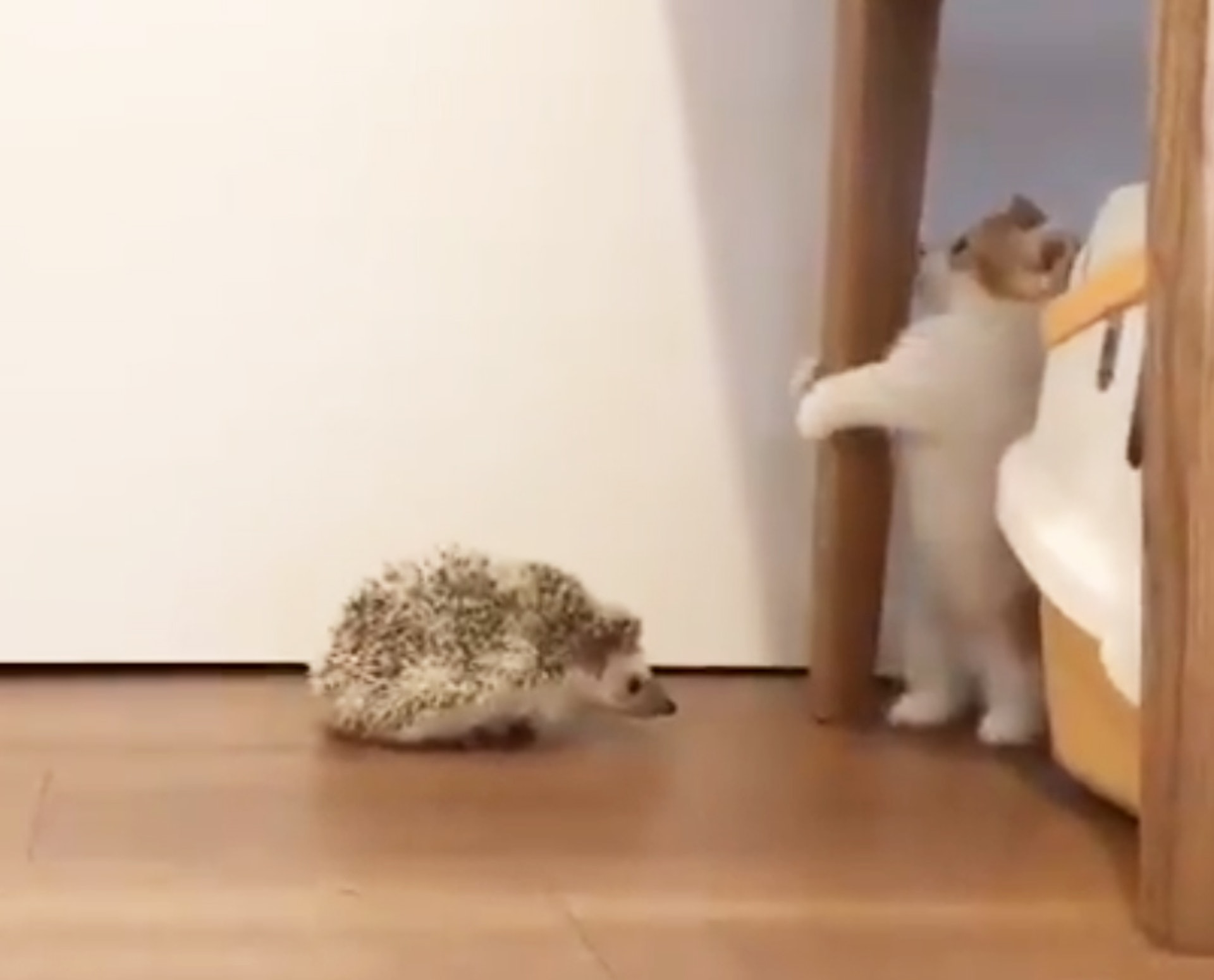 ▼小貓不敢靠近刺蝟,只是圍繞刺蝟轉圈,想從不同的角度觀察牠。小刺蝟朝貓咪走過來時,貓咪連忙後退,無處可退後牠用後腳站立,兩隻手手抱著柱子,楚楚可憐的模樣非常萌。