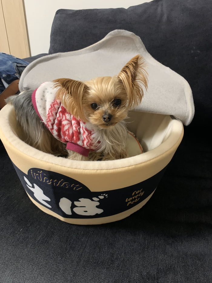 ▼網友們都覺得這種狗窩很有創意,另一位飼主分享自家的「杯麵狗窩」,不過不是烏龍麵,而是蕎麥麵。