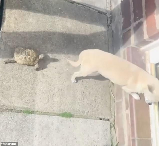 ▼Chilli是一隻很特別的狗狗,牠雖然被熱情的Tuk嚇到,但還是停下倒退的腳步讓烏龜靠近,湊近聞了聞後又跑開。