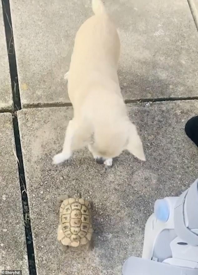 龜龜太想做朋友!加速衝刺「接近吉娃娃」 狗狗被嚇到後退:牠怎那麼快?