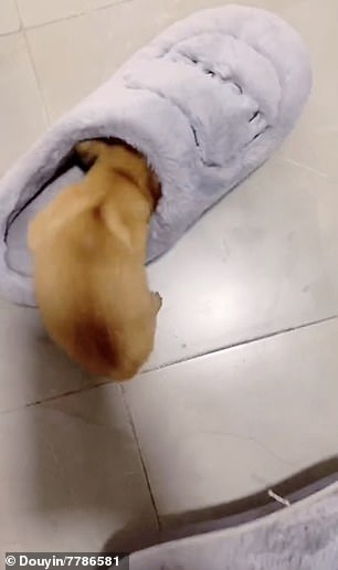 ▼這隻小狗叫「小芝麻」,跟主人生活在哈爾濱。天氣轉冷後,小芝麻最喜歡做的事就是搶主人的拖鞋。主人的拖鞋毛絨絨的,柔軟又厚實,趁熱剛脫下還帶有一點主人角角的溫度,小芝麻待在裡面很溫暖。