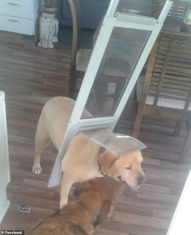 ▼Drax似乎不知道自己發福了,牠卡住後用力掙動,竟然把整扇狗門拆了下來。無可奈何的牠坐在走廊上一臉憨笑,腰上還卡著那扇門,Charmaine回家時看到這一幕當場傻眼。